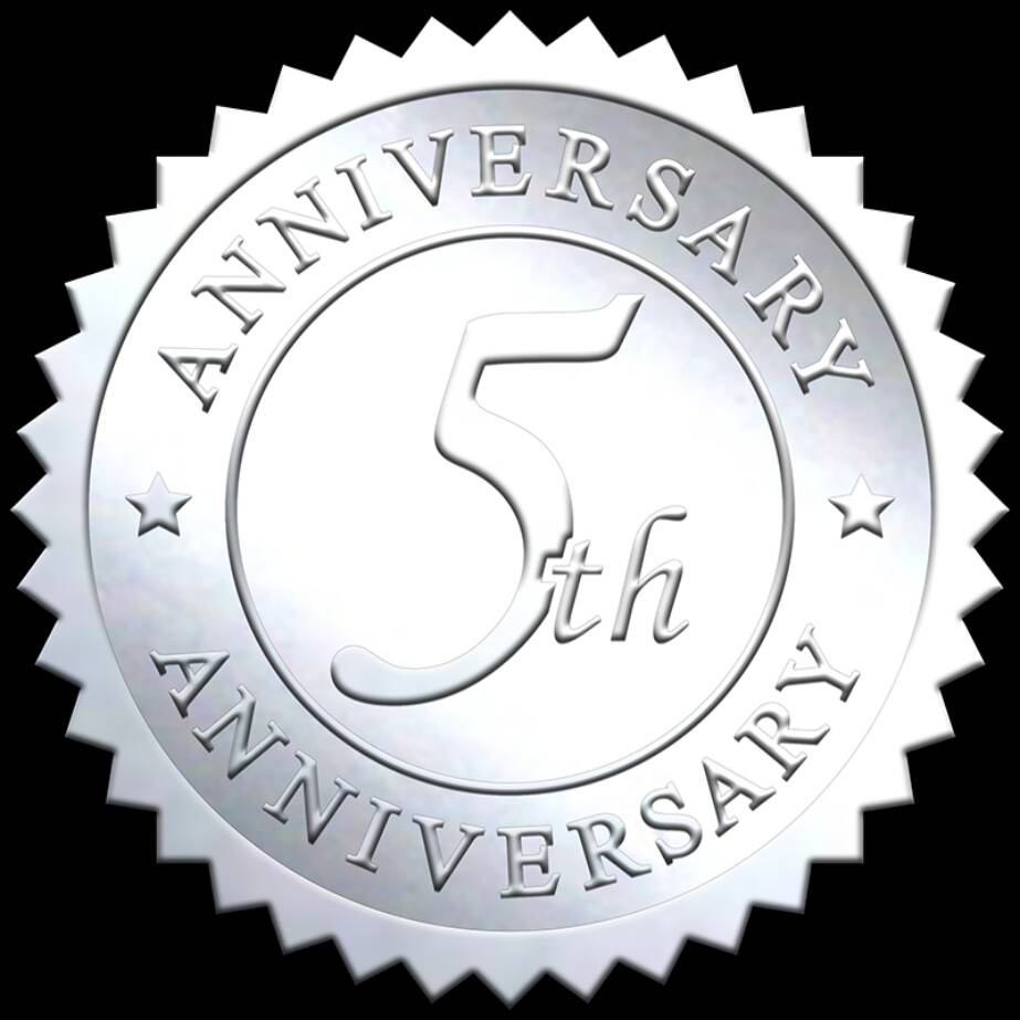 Congratulations! 5 years is an amazing achievement and what better way to celebrate than letting your customers know with a 1.5" starburst 5 year SILVER foil embossed Anniversary Seal.