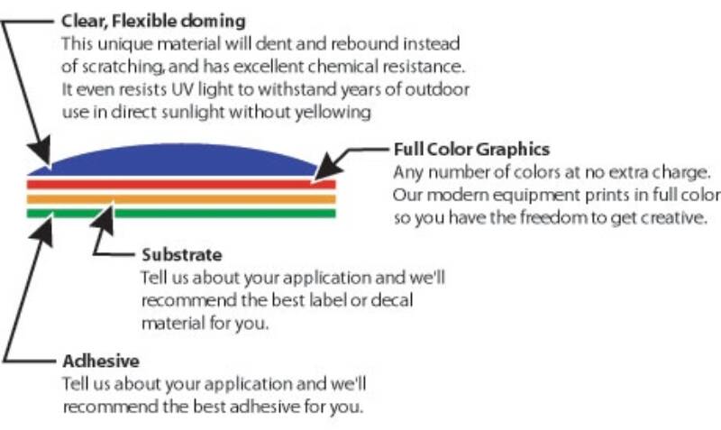 You may have seen our domed labels, stickers and decals on refrigerator handles, computer equipment, car hubcaps and more. Our 3D bubble dome products give you the freedom to magnify your image with enhanced full-color graphics domed under a bubble of crystal clear polyurethane.